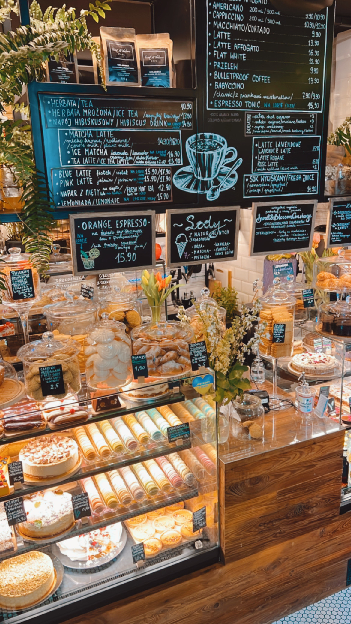 The Sweet & Blossom Café was almost uncomfortably small. Apart from a small wooden slab and two stools in a corner of the interior, the café space was only large enough to fit the impressive display case of baked goods and frozen delectables, and a small counter for the single café employee to handcraft coffee. If any free space existed for the eye to catch a break, it was already filled with decorative flowers. In fact, the café’s whole exterior–a small metal frame just slightly protruding off the major apartment building on Poznańska–was adorned in flowers, just as its interior was.