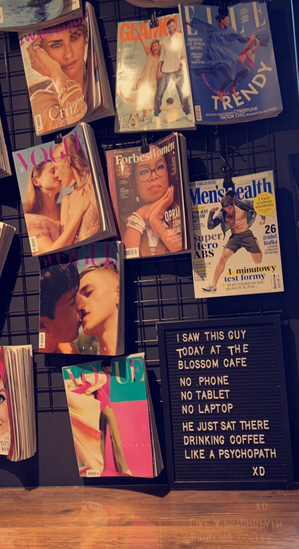 I told her my story. I told her I was gay. And, I confessed my deepest regrets to her over a curated coffee she had whipped up. All around us the flowers were moving in the light draft that the open doors was allowing in, and the sounds of the city outside muffled my weepy words. Ela didn’t say a word while I talked. For nearly 30 minutes, she only listened. After I finished, she pointed behind me. “Turn around,” she said. On the wall was a collection of magazines. I had seen it everyday when ordering my morning coffee, but it looked different since I last saw it a week ago.